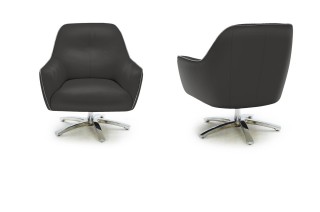 Black and grey leather swivel base lounge chair features a luxurious feel featuring smooth black and gray leather upholstery with white accent. It has a swivel base making it easy to move from one place to another.