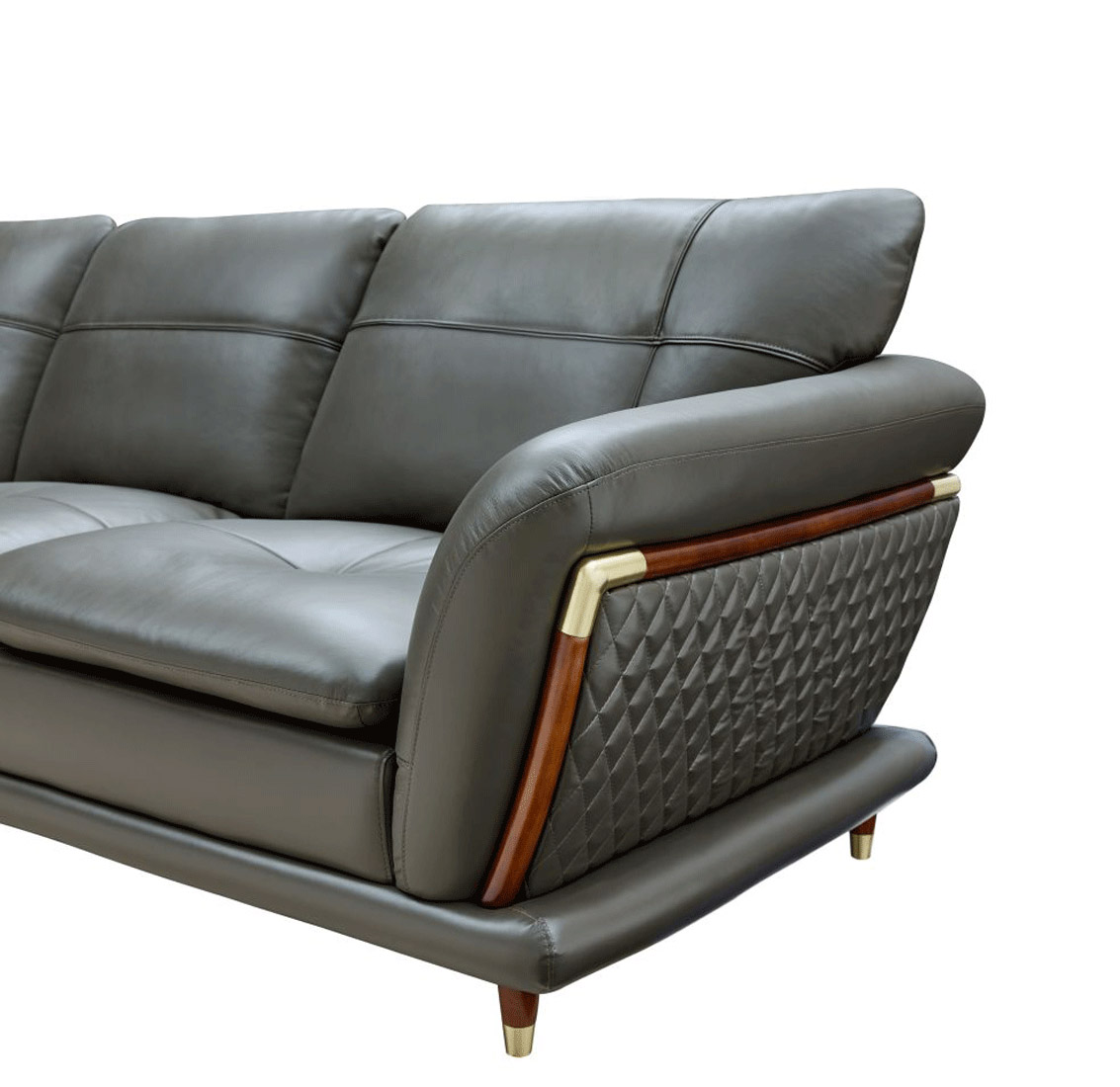 This premium quality living room sectional set features durable construction and is sturdy built. It is available in appealing grey leather with green tones, which perfectly blends with any home decor. The exotic leather color is strikingly contrasted by the darker finish of the wood base in brown and golden accents. This gorgeous set offers comfortable seating with its soft leather seat and back. This sectional is made with smooth, masterfully crafted leather, which enhances the beauty of the pieces. The attractive surface is easy to clean, so you do not have to worry about spills.