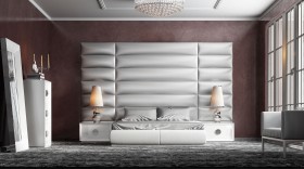 The platform bed will lend more grace, modern charm and harmony to the décor of your comfortable haven. It features a durable platform construction with a headboard, which is padded and upholstered with soft leather. The bed is available in the Full, Queen and King sizes. The nightstand is offered in a set of two to gracefully accompany your bed while you're having your rest and keeping your bedside essentials close at hand. It features two medium-sized drawers with flat panel fronts and a functional rectangular top covered with quality scratch-resistant lacquers.