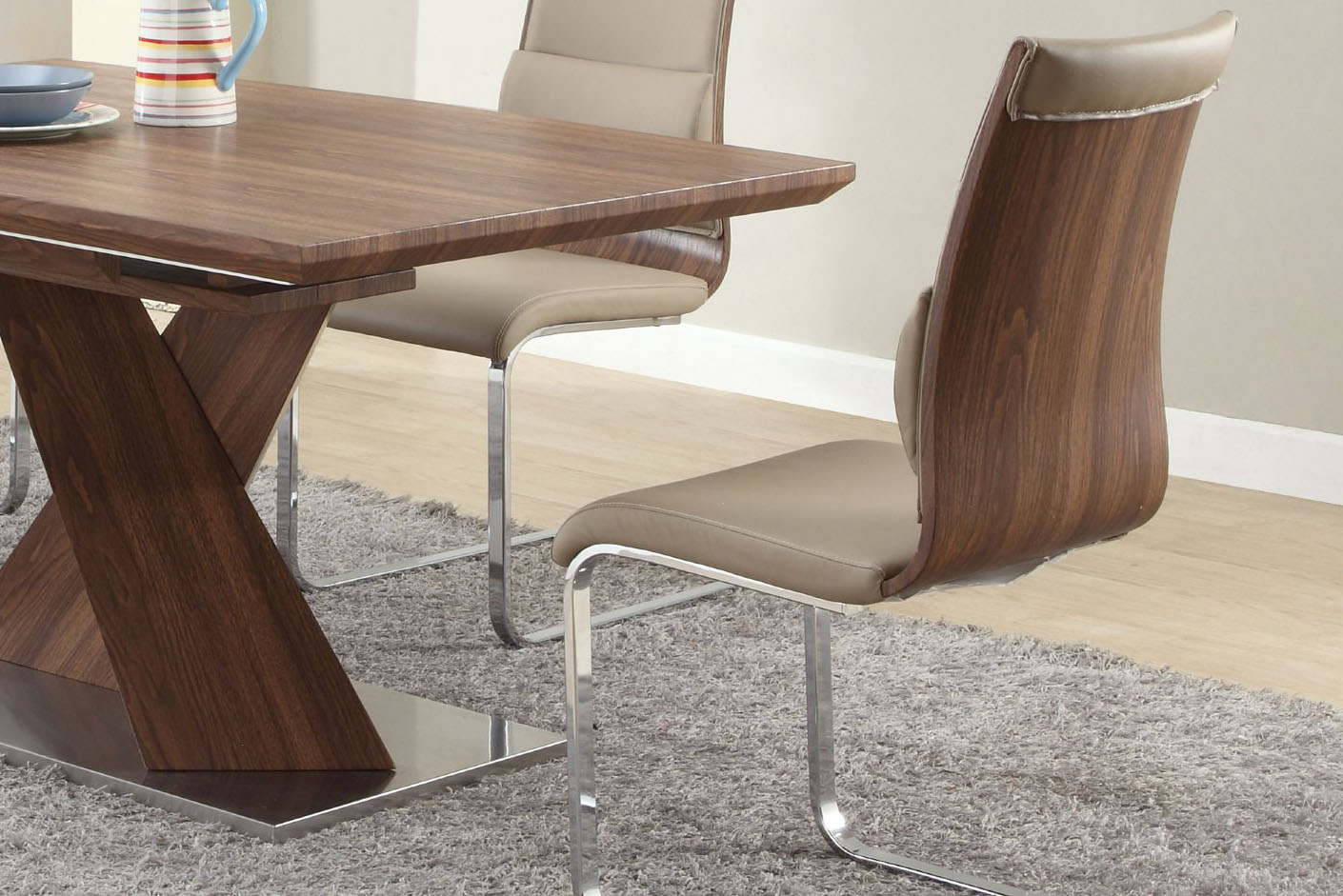 The table has a sleek wooden-looking top and an extension for extra people. A polished metal plate and wooden base complement and enhances the table's modern flair. Completing this group are four dining chairs in beige upholstery with elongated backs stylishly descending to the floor. This beautiful dining set includes the table and four leather side chairs, with additional pieces available at extra cost. The handsome table has a glamorous modern appeal, with self-storing extension mechanism.