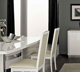 Including a dining table with pedestal base and 18" extension, and 4 upholstered chairs in white lacquer finish. This dining set will make the final touch to any modern designed dining room. A 2-door curio with lights and a 4-door buffet can be added to the set. Curio and buffet are accented with elegant chrome handles and as with all of Prime Classic Design's premium collection dining room come equipped with soft self-closing doors.