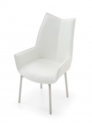 The dining chair features a wide base construction which offers extra stability for the streamlined design. Upholstered in white leatherette and accented with stainless steel legs. Available in light and dark grey and blue. The chair features a swivel base. The white finish makes this chair perfect for any contemporary home.
