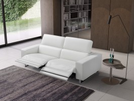 Grace sofa in a unique design. This set is made of white leather upholstery and stainless steel legs under the sofa to complete the modern look. Adjustable headrests, deep padded cushions and spacious seating area create extremely comfortable surroundings. With its simple and clean lines, this sofa set fits elegantly almost in any space. Stressing on “comfort, support, and style”, this elegant recliner with ottoman will give any space a whole new diminution.
