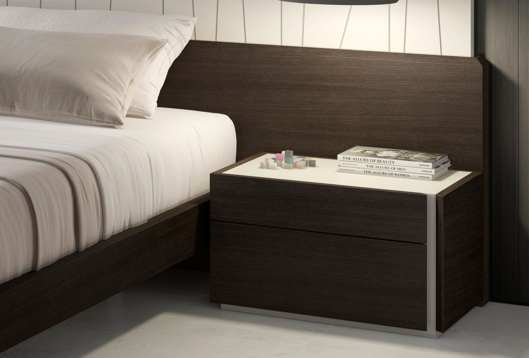 Made in Portugal. Featuring simple yet refined styling, the sleek lines of the luxury bed will infuse your room with a vibrant, contemporary aura while providing extra storage space. Designed with beautifully mixing a natural light grey lacquer finish which looks striking against the natural wenge wood veneer. This spacious bed features built-in LED lights featuring a dimmer function are on. Prime Classic Design premium bedrooms are crafted from the highest quality materials. We use hand-selected woods, wood veneers and natural lacquers as well as the finest German hardware by Blum. There is no doubt that these are our finest bedrooms yet.