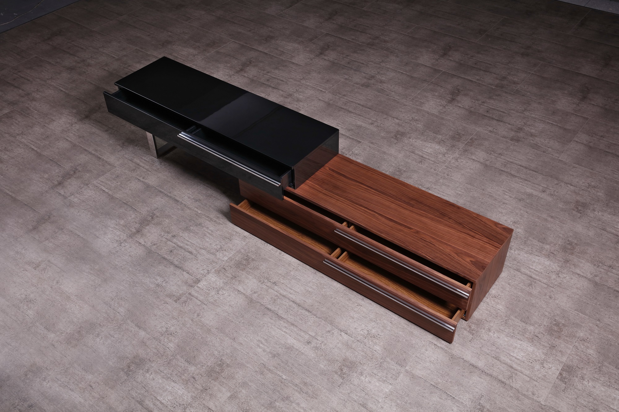 The Long LCD TV furniture with storage in walnut is classy, sophisticated and yet simple. This TV unit have a wide drawers with plenty of space for media devices and equipped with soft closing tracks provide sufficient storage for a plethora of items. Walnut which gives it character and history even though it's a new piece. A low-standing and extendable TV bench characterised by the Z shape of its frame. A timeless classic, the TV base blends elegantly into your home relaxation room. Hang your TV on the wall, and place this unit underneath for the perfect accentuated look. Discover all the details!