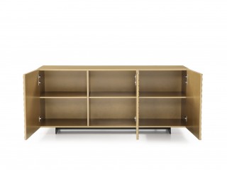 The buffet looks luxurious in a high gloss gold finish with wave doors and black matte metal legs