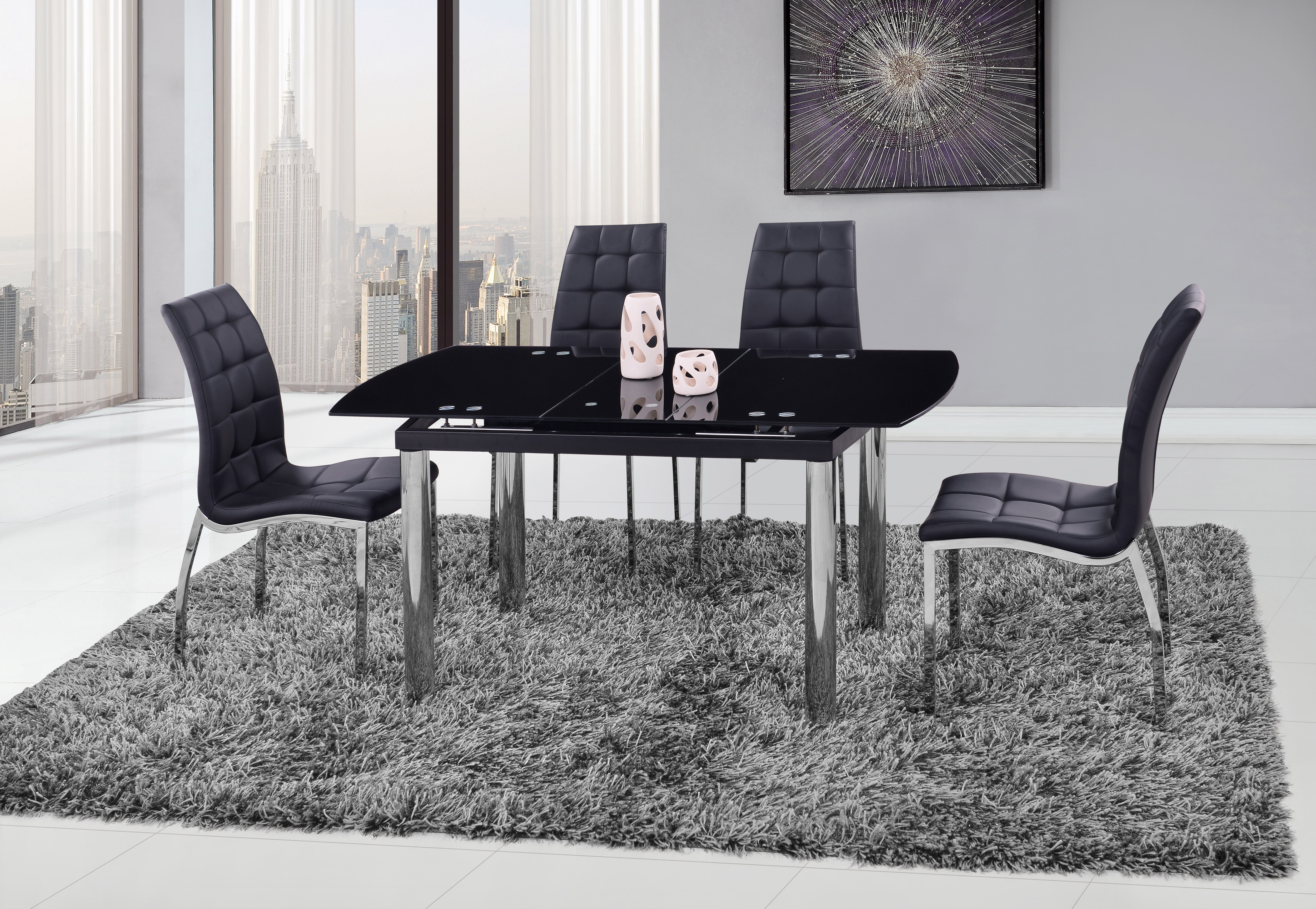Entertain guests and enjoy dining at home with this amazing dining ensemble. Constructed of glass and stainless steel with a chrome finish, this glass dining table offers clean lines and visual appeal to your home decor. The table features a black extendable glass top and a unique design. When extended, this dining table can seat up to eight people, big enough for large gatherings of friends and family.