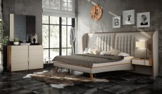 Ultra contemporary ivory grey upholstered bed with glossy ivory case goods. Designed in modern style and finished in ivory grey, this bedroom set consists of an ivory gray upholstered bed, 2 nightstands, dresser and mirror. One of our newest collection, the bed set combines form and function. The curved headboard of the bed hints at a feminine styling, while the light oak finish and sharp angles boast a very masculine feel. This new collection is sure to have mass appeal. Not to mention the silver hardware adds a flare of its own. The bed has a unique curved frame, a special nanofiber padded headboard and wooden legs. The case goods are ... more info |