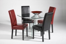 All tempered clear glass x base table with red and black chairs set. Comfort has to be felt and beauty has to be appreciated, the X base collection aims at serving your decor with both. Available in chrome connectors. The clear square round glass is easy to clean and maintain. The X-shaped base gives the table a unique appearance. The chairs are upholstered in a durable leather match for lasting durability. Wooden legs in black finish for a stylish feel, straight back design gives the chair a classic look. As you already noticed, the tabletop supported by two glass table legs. The glass is strong and durable. This table is the epitome of ... more info |