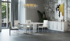 Matt table in marble ceramic top and fabric chairs from Spain. The collection flaunts elegant, contemporary designs that are sure to redefine style in your charming settings. Elegance is at the top level with this amazing modern dining room table which expresses all its beauty and technology through its fantastic details such as its curved edges where the legs meet the sleek tabletop. Legs meet tabletops at perfect angles to convey a scene of balance and uniformity. Crafted from the choicest solid woods, the sleek, neat lines of the table are lavished with a lustrous matt finish. The smooth contours of the upholstered chairs lend a refined ... more info |